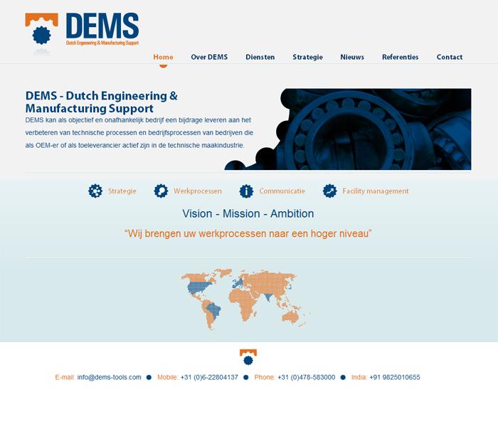 Het grafisch ontwerp van de website sluit perfect aan bij de eveneens door Encore gerealiseerde huisstijl met logo. Op basis van deze nieuwe huisstijl is het ontwerp en drukwerk van diverse huisstijlmiddelen verzorgd waaronder visitekaartjes. Om de doelgroep nog meer aan te spreken, spelen technische beeldimpressies uit de branche van DEMS een belangrijke rol op de website. Mede door het gebruik van deze beelden heeft de site een moderne, actuele en frisse uitstraling.