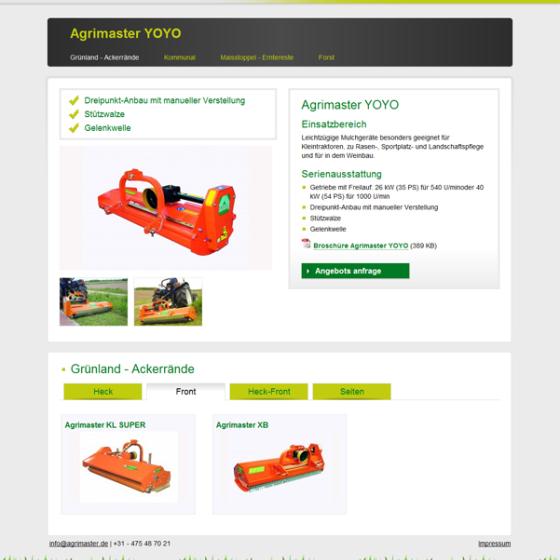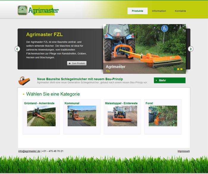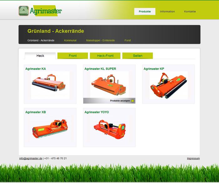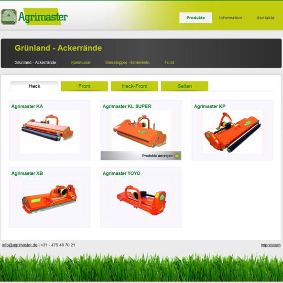Door een categorieselectie op de homepage van de website zijn in één oogopslag de beschikbare maaivarianten van Agrimaster machines te bekijken. Een bezoeker kan vervolgens via tabbladen verder navigeren op de website. Het overzichtelijke grafisch ontwerp spreekt de brede, overwegend Duitse, doelgroep aan. Het ontwerp spoort aan om uiteindelijk een offerte aan te vragen voor één van de machines.