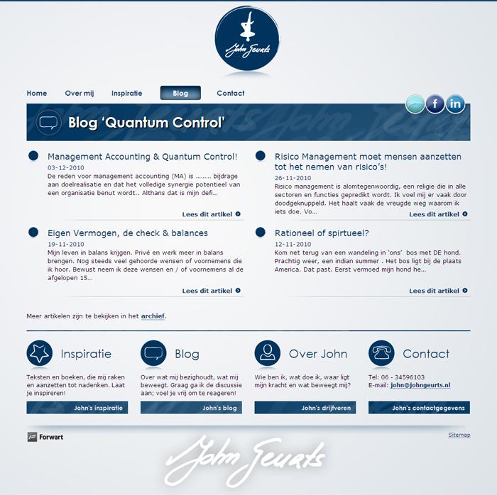 Encore is verantwoordelijk voor de ontwikkeling van de huisstijl met logo, grafisch ontwerp, technische realisatie en hosting van de website. De website is geïmplementeerd op basis van een gebruiksvriendelijk Content Mananagement Syseem (CMS) waarmee John de inhoud van de website kan actualiseren.