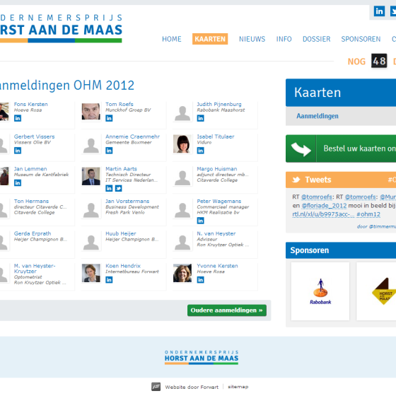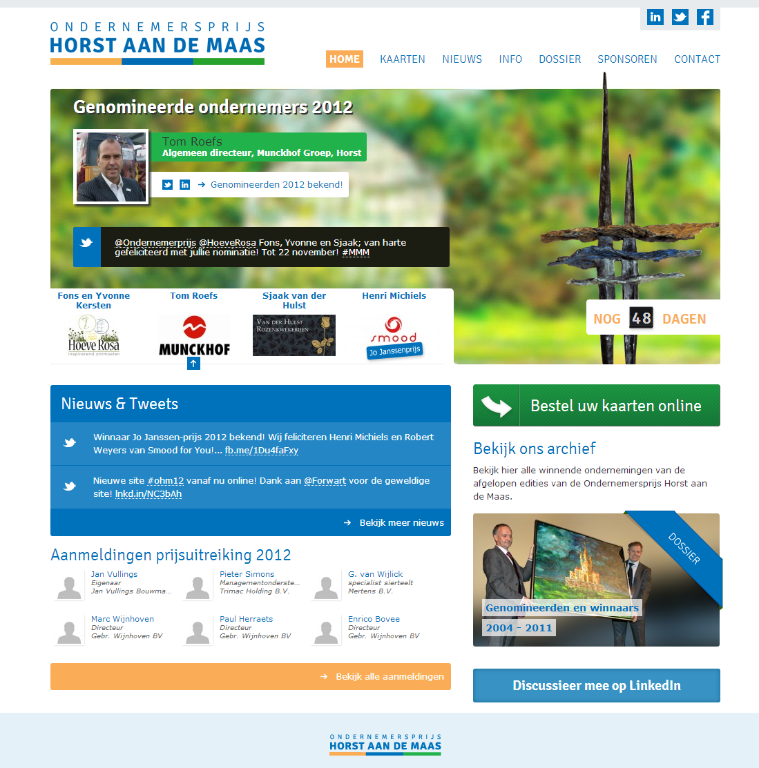 Encore heeft een nieuwe website gerealiseerd voor de Ondernemersprijs Horst aan de Maas (OHM). De vorige website - die door Encore in 2005 gerealiseerd werd - was toe aan vernieuwing. De website is uitgerust met diverse moderne toepassingen en de homepage van de website is nu eenvoudiger te actualiseren door de stichting. De genomineerde ondernemers worden prominent gepresenteerd, inclusief foto, logo, links naar Twitter en LinkedIn.
