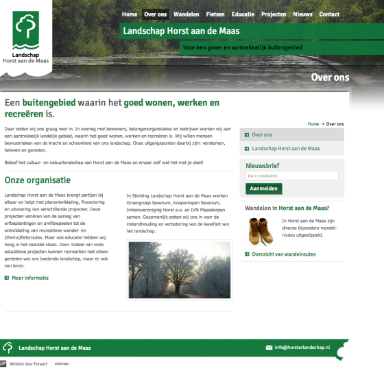 Het landschap van de gemeente Horst aan de Maas en de expertise van de stichting komen uitgebreid tot uiting op de nieuwe website. Op de homepage wordt de stichting aantrekkelijk gepresenteerd en kan de bezoeker direct een keuze maken uit de belangrijkste informatie van de website. Zo kan bijvoorbeeld direct genavigeerd worden naar diverse wandel- en fietsroutes in de gemeente en informatie rondom erfbeplaning.