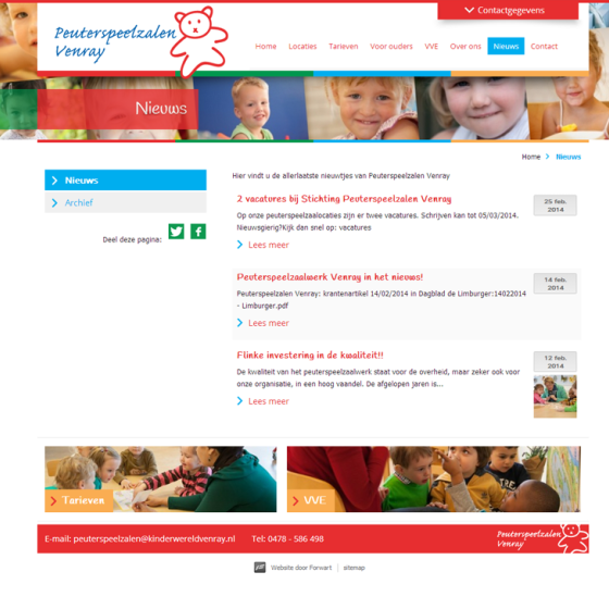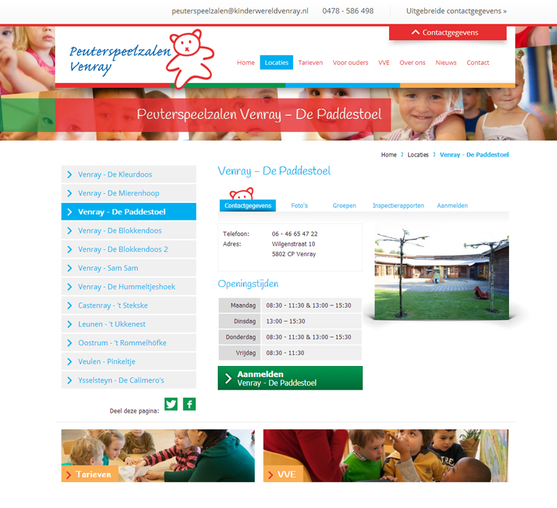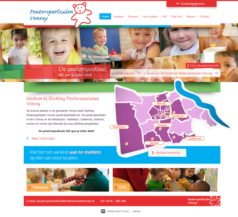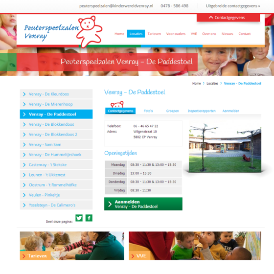 Encore heeft de nieuwe website voor de stichting gerealiseerd met uitgebreide informatie over de locaties, online aanmelden, informatie over tarieven en nieuws. De stijl van de website sluit aan bij de gewenste uitstraling van de peuterspeelzalen en bovendien zijn veel kindergezichten gebruikt in de website. De compositiefoto aan de bovenkant wordt elke dag automatisch in willekeurige volgorde opnieuw opgebouwd zodat er altijd een unieke samenstelling te zien is.