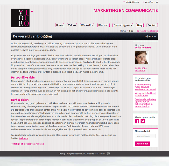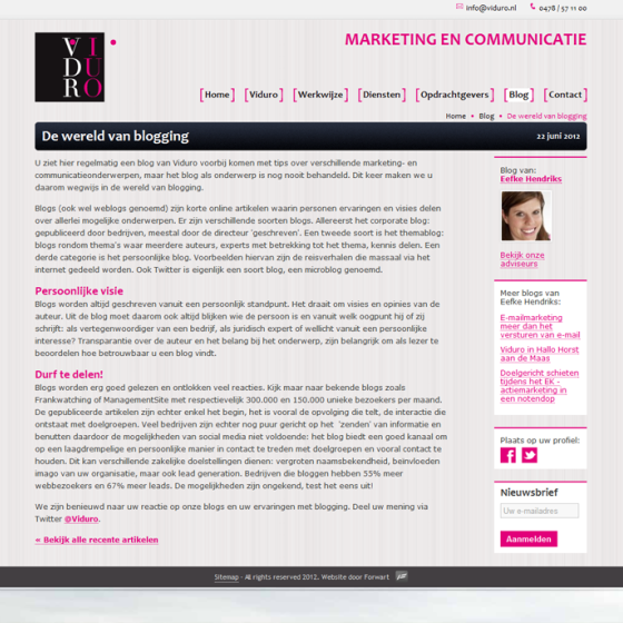 Het grafisch ontwerp van de website is op diverse punten aangepast en de website is bovendien uitgebreid met een homepage die meer interactie bevat, een blog die gekoppeld is aan de adviseurs en een nieuwsbrief. Met het beheersysteem van de website kan de opdrachtgever zelf de volledige website aanpassen en uitbreiden. Bovendien is er een verwijzing opgenomen naar de sociale media pagina’s van Viduro en zijn recente tweets door een Twitter integratie op de website te bekijken.