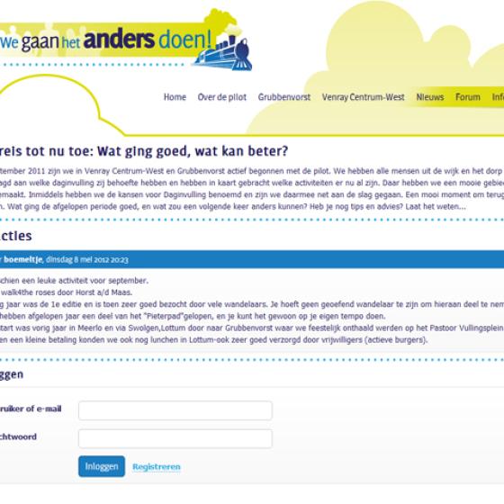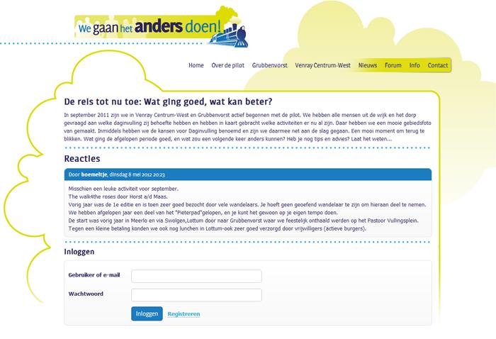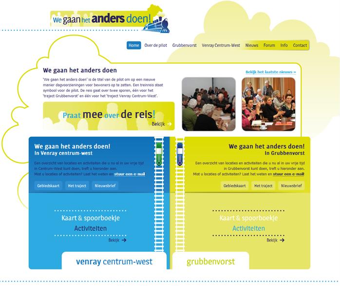 ‘We gaan het anders doen’ is de titel van de pilot van de gemeenten Horst aan de Maas en Venray om op een nieuwe manier dagvoorzieningen voor bewoners op te zetten. Een treinreis staat symbool voor de pilot. De reis gaat over twee sporen, één voor het ‘traject Grubbenvorst’ en één voor het ‘traject Venray Centrum-West’. In samenwerking met Studio Spinazie heeft Internetbureau Encore een website gerealiseerd voor dit project. Studio Spinazie is verantwoordelijk voor de realisatie van de huisstijl en Encore voor het ontwerp en techniek van de website. Bovendien is de website voorzien van een Content Management Systeem (beheersysteem) waarmee de opdrachtgever zelf - met meerdere redacteurs - de volledige inhoud van de website kan bijhouden.
