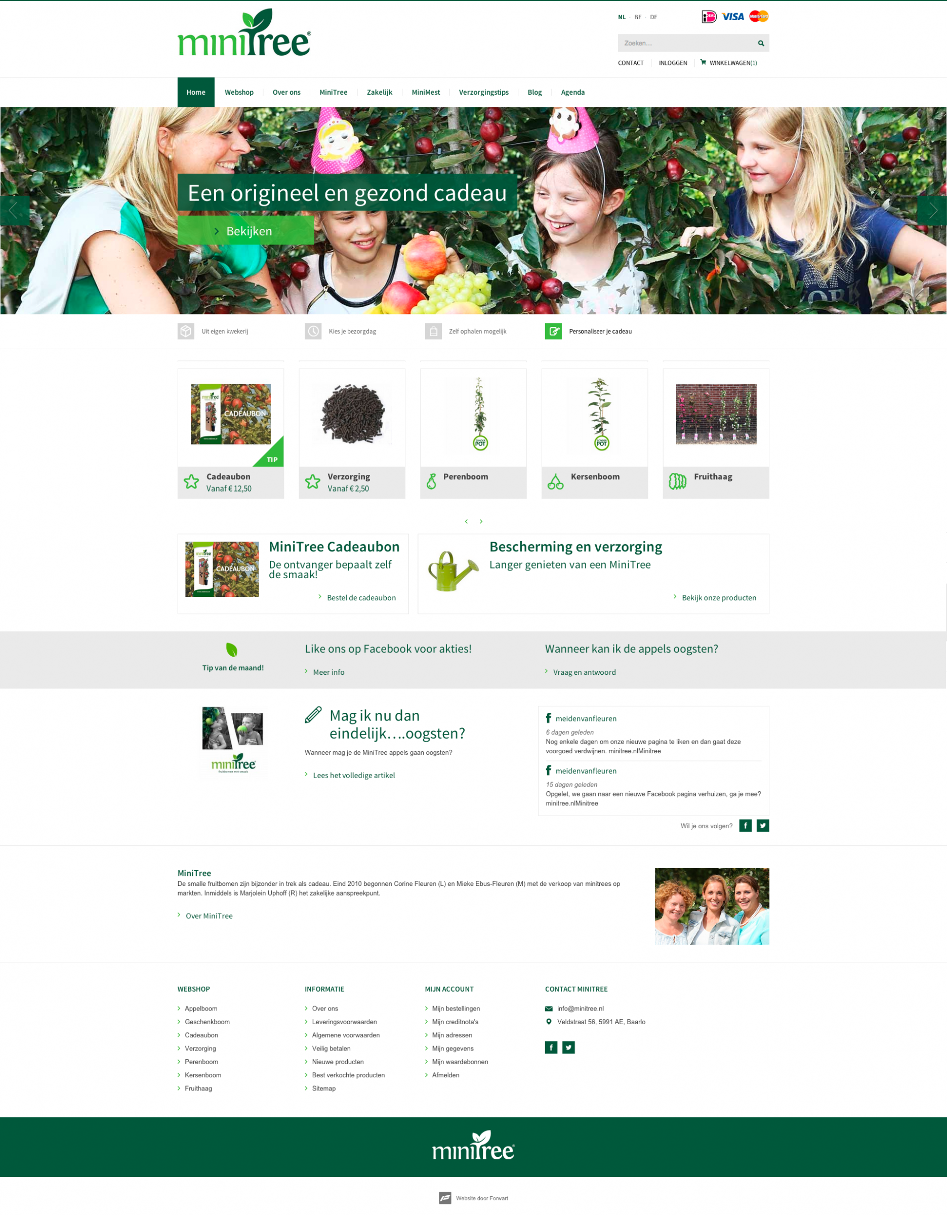Het professionele ontwerp van de webshop sluit perfect aan bij de gewenste uitstraling van MiniTree. Het aanbod van fruitboomjes en aanverwante producten wordt uitgebreid gepresenteerd op de website met informatieve teksten en professionele fotografie. De webshop is uitgerust met moderne technieken en voorzien van een responsive webshop ontwerp. Hierdoor werkt deze multi-screen site op elk scherm en apparaat perfect. Een analyse van webstatistieken bevestigt het nut van een responsive ontwerp. Bijna de helft van het totale aantal bezoekers heeft de website reeds via een smartphone of tablet bezocht. Een responsive webshop leent zich perfect voor zowel de oriëntatie als aankoop van producten. Encore is specialist in de ontwikkeling van responsive webshops.