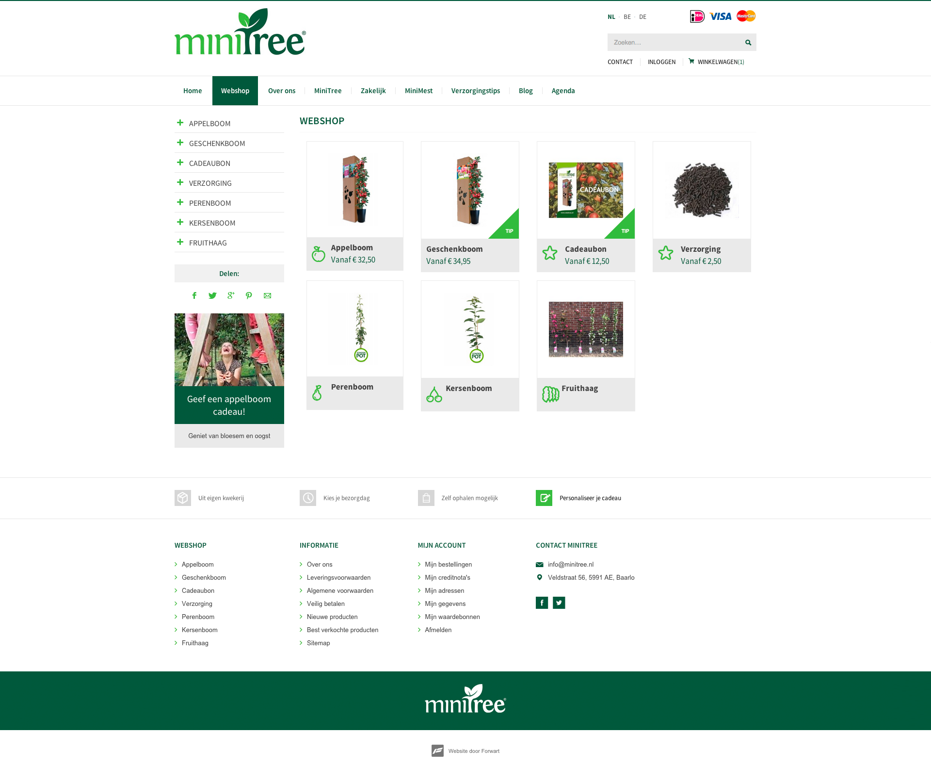 MiniTree is uitvinder en leverancier van kleine fruitbomen. De boompjes in cadeauverpakking zijn leuk voor particulieren en lenen zich bovendien perfect als (relatie-) geschenk. Naast de verkoop van de verschillende soorten fruitbomen levert het bedrijf een assortiment van bijhorende verzorgingsproducten. Encore heeft voor het in Baarlo gevestigde MiniTree een volledig nieuwe webshop realiseerd.