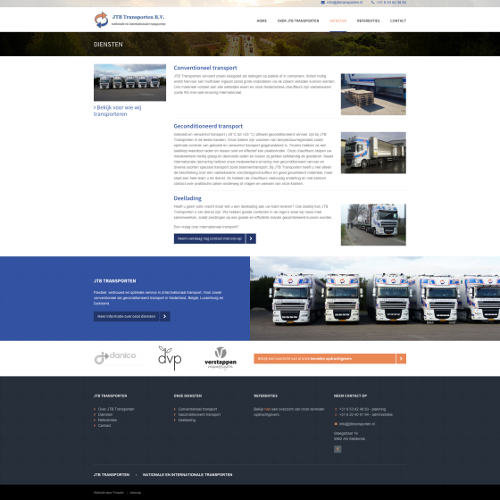 De expertise en kwaliteit van het transportbedrijf komen terug in het ontwerp van de nieuwe website. Op de homepage wordt het bedrijf aantrekkelijk gepresenteerd en kan de bezoeker direct een keuze maken uit de belangrijkste diensten en producten van JTB Transporten. Bovendien is de website uitgerust met moderne technieken zoals een responsive ontwerp waardoor de website ook perfect werkt op bijvoorbeeld een smartphone en tablet.