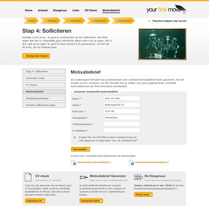 Encore heeft een nieuwe website en modern logo gerealiseerd voor YourFirstMove. De vormgeving van de website legt sterk de focus op de inhoud. De vier stappen komen prominent terug in het ontwerp en elke stap is voorzien van een ludieke tekening. In de verschillende stappen kan een bezoeker niet alleen informatie lezen, maar ook gebruik maken van diverse online tools. Via een CV-check kan een bezoeker een CV uploaden waarna die wordt gecontroleerd door het team achter YourFirstMove. Tevens bevat de website een aantal voorbeelden van CV’s en motivatiebrieven. Door het invullen van de persoonlijke gegevens op de website kan de bezoeker direct een gepersonaliseerd Word bestand met motivatiebrief en CV downloaden.