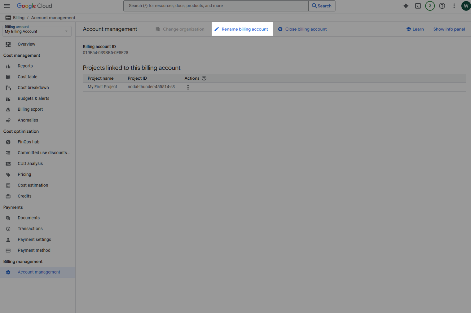 - Klik op het zojuist aangemaakte billing account (meestal heeft deze een naam vergelijkbaar met My Billing Account).
