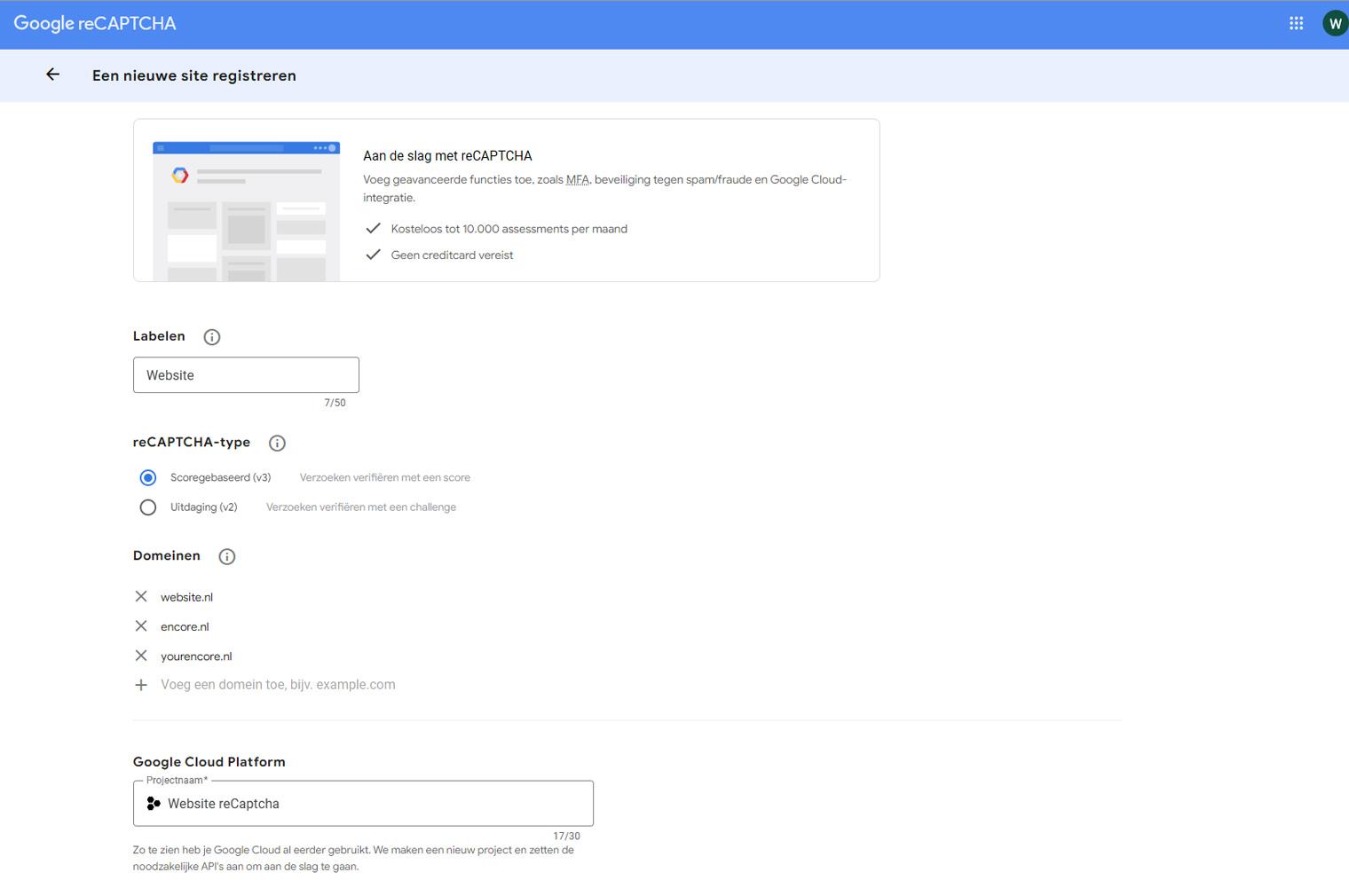 Dit is een referentie voor jezelf, in de meeste gevallen kun je hier dus bijvoorbeeld Website invullen. - reCAPTCHA-type: